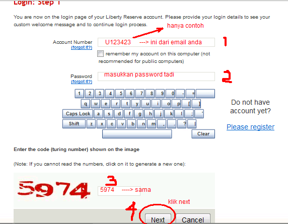 9. Ikuti petunjuk gambar diatas dengan benar. Dan SELAMAT, anda sudah mempunyai akun rekening www.LibertyReserve.com gratiss